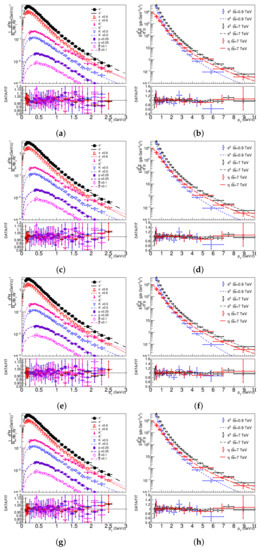 The double-differential transverse momentum distributions with the fits by (a,b) Equation (1), (c,d) Equation (2), and (e–h) Equation (3), with the parameter left free (e,f) and (g,h). The data are from proton-proton collisons at the center-of-mass energies, 0.9 and 7 TeV; taken from [27,28].
