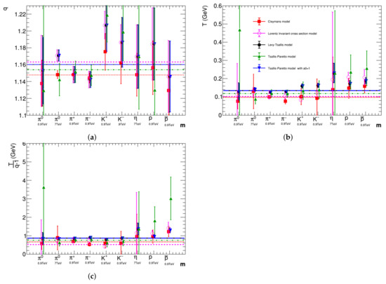 Behavior of the Tsallis exponent, q, temperature, T, and the ratio, , as a function of the particle species. extracted from the fits with different formulas. The relation, , used where necessary (see the text for details). (a) Tsallis exponent, q (b) temperature, T (c) the ratio, .