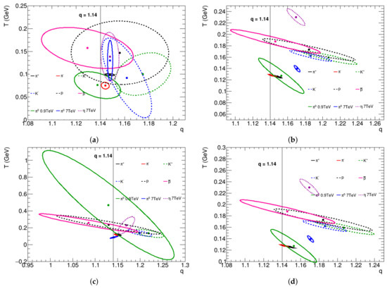 Joint confidence region on the T–q plane in the parameter space, with significance, . The regions are obtained by using (a) Equation (1), (b) Equation (2), and (c,d) Equation (3), with (c) the parameter left free to adjust and (d) fixed to the value . The results for 7 TeV are indicated by the asterisks and the results for 0.9 TeV are indicated by the solid circles for the centers of the ellipses.