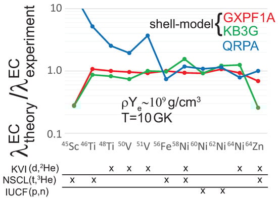 - Cole, A.L.; Anderson, T.S.; Zegers, R.G.T.; Sam, M.; Austin, B.; Brown, A.; Valdez, L.; Gupta, S.; Hitt, G.W.; Fawwaz, O. Gamow–Teller strengths and electron-capture rates for pf-shell nuclei of relevance for late stellar evolution. Phys. Rev. C. 2012, 86, 015809. [Google Scholar] [CrossRef] [Green Version]