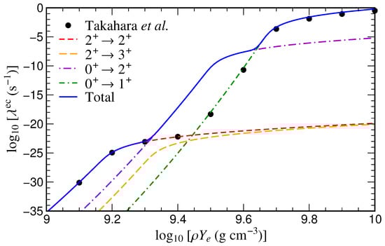 - Takahara, M.; Hino, M.; Oda, T.; Muto, K.; Wolters, A.A.; Glaudemans, P.W.M.; Sato, K. Microscopic calculation of the rates of electron captures which induce the collapse of the O+Ne+Mg cores. Nucl. Phys. A 1989, 504, 167–192. [Google Scholar] [CrossRef]