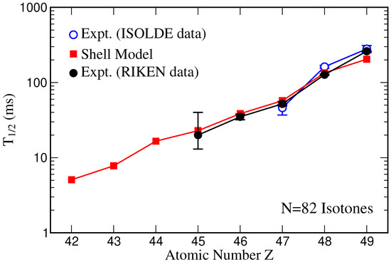 Particularly important for the r-process mass flow are the waiting point nuclei at the magic neutron numbers N = 50, 82 and 126, which have rather long half lives due to their closed-shell configurations. For these nuclei, large-scale shell model calculations exist. Importantly, a few of these half lives could also been measured, showing good agreement with the shell model results: for Ni, an experiment done at the National Superconducting Cyclotron Laboratory (NSCL) experiment found a half life of ms [94], while the shell model predicted 127 ms [4]. Data and shell model results for the waiting points are compared in Figure 3. Unfortunately, no data exist yet for waiting points. For these nuclei, two independent shell model calculations have pointed to the importance of forbidden transitions induced by intruder states [21,22]. These forbidden transitions are predicted to shorten the half lives of the waiting points noticeably and enhanced the mass flow through these waiting points [95]. This implies more r-process material available for fission, thus affecting the abundances of the second r-process peak around atomic mass number, , which for very neutron-rich ejecta is built up by fission yields [95,96]. The enhanced mass flow also increase late-time -decays from the decaying r-process matter, which influence the kilonova signal [97].