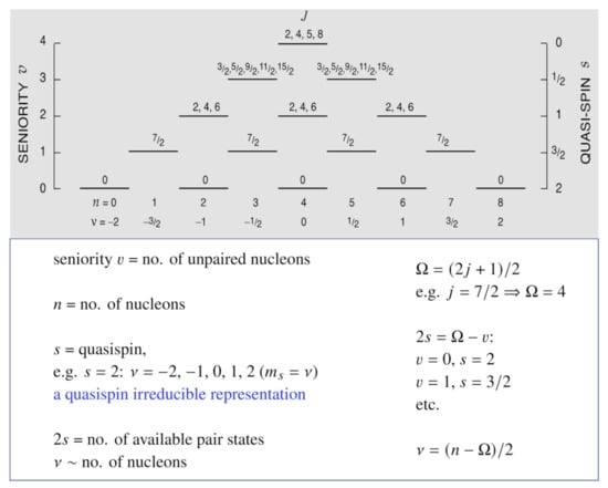 5]. Specifically, the quasispin algebra is recognized by expressing the Hamiltonian and the interaction using second quantization. The mathematics emerge by taking bilinear combinations of the elements (one-body fermionic creation and annihilation operators) of a Jordan algebra (anticommutator brackets of the creation and annihilation operators). These bilinear combinations obey a Lie algebra (commutator brackets). This is impossible to see until one works out the Lie bracket values of the bilinear combinations, which is done by expanding them using anticommutator bracket relations so as to express everything in terms of Jordan algebra elements in “normal order”; see Equation (4.93) in Ref. [