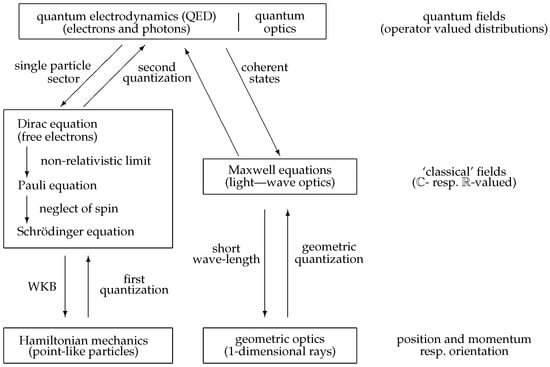 This raises another important issue: What is the classical limit of photons—optical rays or Maxwell’s theory of electromagnetism, i.e., essentially wave optics? While Maxwell’s theory is considered “classical physics” for many reasons (some of them are summarized in Section 5), ray optics is a particular limit of this classical theory. However, on a formal mathematical level, Maxwell’s theory should be compared to Schrödinger’s or Dirac’s theory of electrons, which are unequivocally quantum theories of electrons; see Figure 1.
