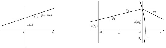 Let us denote by the point, where a geometric ray punctures a plane orthogonal to the z-direction, which is taken to be the propagation direction of the ray. Furthermore, we denote by the tangent of the angle (between the z- and the x-direction) of the ray (see Figure 2). We can now represent the configuration of a ray by a two-dimensional vector . For simplicity, we consider this as a one-dimensional problem. In general, and will each be two-dimensional vectors (the location in the plane at point z in the propagation direction of the ray and the two tangents specifying the orientation of the ray at this plane) leading to a four-dimensional formalism.