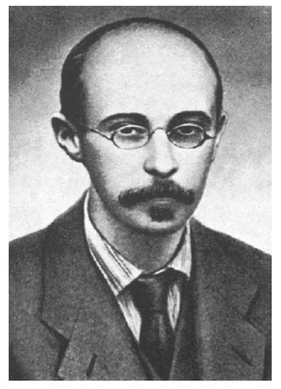 Alexander Friedmann (see his photo in Figure 1) was born on 6 June, 1888 in Saint Petersburg (the capital of Russian Empire) in the artistic family (a full description of his life can be found in [8,9]). Alexander Friedmann’s father’s name was also Alexander. He was an artist at the Court Ballet of the Imperial Theater and a ballet composer. Alexander Friedman’s mother’s maiden name was Lyudmila Voyachek, she was a pianist. She graduated from the Saint Petersburg Conservatoire. Nothing indicated that a child born in such a family will become an eminent mathematician and physicist. After the divorce of Friedmann’s parents in 1897, he lived with his father. In the same year, he started to study at the Second Saint Petersburg High School which was known for the highly qualified teachers in the field of mathematics and physics.