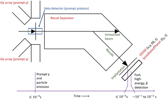 A schematic diagram summarising the recoil-beta-tagging technique, [29] used for identifying prompt decays, emitted from proton-rich nuclei through tagging with the characteristic superallowed -decay of the residue ground state. See text for details.