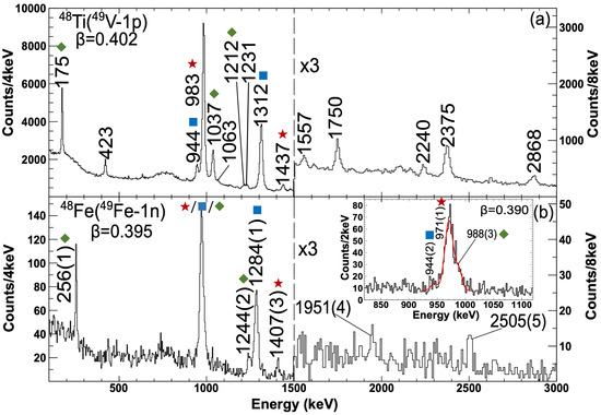 The spectra in Figure 3 show the resulting -ray spectra for this mirrored reaction: Figure 3a shows the V Ti reaction and Figure 3b the mirrored Fe Fe reaction. One can see very similar population distribution from the spectra. The spectra, as expected, are dominated by the decays from the states (labelled with blue squares), the states (green diamonds) and the states (red stars) [8,41]. The spectra also show the clear benefit of using a Ge -ray tracking array (i.e., GRETINA) for in-beam spectroscopy with relativistic beams. The position-sensitivity afforded by the pulse-shape-analysis approach allowed for accurate Doppler reconstruction (e.g., [38]), reducing the otherwise huge impact of Doppler broadening at these high fragment velocities.