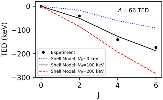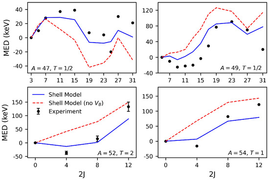 Figure 4 shows experimental and shell-model MED in the shell. The solid blue lines contain the full shell-model calculation, performed exactly as described in Section 3, with a single isovector matrix element of keV, the figure extracted from the fits [17] (see Table 1). The red dashed lines show the calculations without included. It is clear from data like these the crucial role that this effective INC interaction has, especially at low J, in the description of MED in the region.