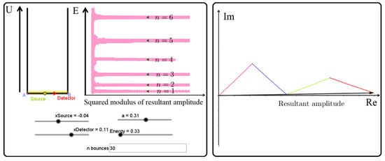 Analytically, the allowed energy levels (the poles of the energy dependent Green function) can be determined uniquely from the condition that two paths differing for a full back and forth round trip in the well are in phase. Thus, the full Green function can be determined and the stationary wave functions (eigenfunctions) can be also evaluated. The set of GeoGebra tutorials [31], created to support student understanding of quantum concepts within the sum over paths approach [16,17], have been tested with both secondary school students and pre-service and in-service teachers in several courses. Since the simulations are available for free on the GeoGebra website [31], they have also occasionally been modified by teachers to produce simulations of different physical situations or more suitable to the needs [32], or considered in other research [33].