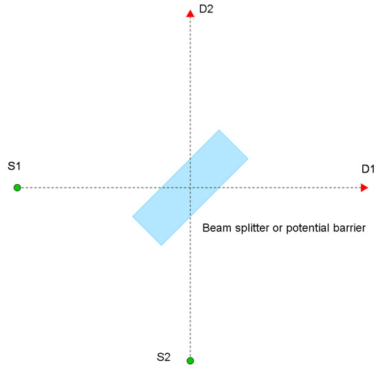 The Hong-Ou-Mandel (HOM) experiment [39] demonstrates interference between indistinguishable processes, and its generalized version [15] using electrons can be used to explain the properties of bosons and fermions. The general setup of the HOM experiment is depicted in Figure 6. The experiment is known in its original version performed with photons, as it demonstrates the possibility of two photon interference due to perfect time overlap and consequent indistinguishability. A less known version of the experiment with electrons was also performed [40].