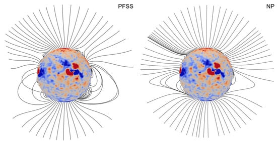 - Altschuler, M.D.; Newkirk, G., Jr. Magnetic Fields and the structure of the solar corona. I: Methods of calculating coronal fields. Sol. Phys. 1969, 9, 131–149. [Google Scholar] [CrossRef]