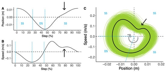 (A) Attractor of the centred vertical position of the body’s centre-of-mass (COM) versus time, expressed in % of step time. (B) Attractor of the vertical speed of the COM versus time, expressed in % of step time. (C) Typical plot of COM vertical trajectory in phase space (solid green lines representing 508 gait cycles) during walking for a participant and of the corresponding attractor (solid black line). The straight arrows outline the deviation from genuine harmonic oscillator. The curved arrow is the arrow of time. Note that a closed loop corresponds to one step cycle, a complete gait cycle being composed of two step cycles. The blue dotted line separate the single stance (SS) and dual stance (DS) phases.