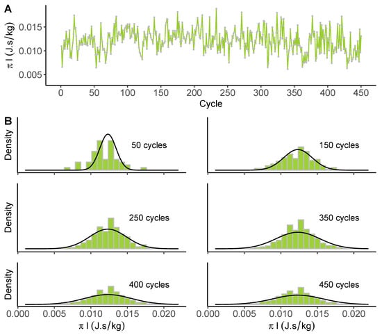 (A) Adiabatic invariant versus time (grey points) for a given participant. Lines are added to guide the eyes, and time is expressed in cycle number. (B) Typical plots showing the comparison between the theoretical distribution, (solid line), and the experimental distribution, (histograms), after 50, 150, 250, 350, 400 and 450 cycles for the same participant as in (A), with %. Fitted parameters are equal to J·s/kg and m2/s. See text for details.
