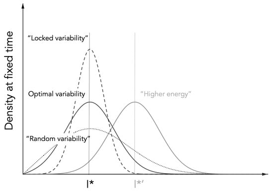We conjecture that the shape of the distribution might be sensitive to the experimental condition and/or to each participant, as shown in Figure 4. In particular, there should be an optimal values of the diffusion coefficient D and of for a young, healthy individual. Too large value obtained for D would reflect a lack of or altered motor control of the participant, leading to variability that tends to be random, as observed in the stride interval variability of patients with neurodegenerative diseases [39], for example. Too small value for D can be related to insufficient adaptability of the participant: the number of available patterns (i.e., different values of I) is not maximal. Such a case is observed, for example, in the electrocardiographic signal of patients with cardiovascular disease [36] or in healthy children, whose walking patterns are more stereotyped than in adults [40]. The diffusion coefficient then offers a novel way to quantify the general behaviour of internal models developed for a given task. Indeed, wide distributions (high D value) are observed after time spent to experience or explore a task. On the other hand, narrow distributions (small D value) may reflect a lack of generalisation of the motor strategies adopted. In motor control—and rehabilitation in particular—the concept of generalisation is tightly linked to the one of transfer [41,42,43]. When working toward recovering lost or impaired motor functions, the challenge is to find the best possible movements that can be transferred to as many functional tasks as possible. These movements may be interpreted as fundamental bricks of the action repertoire. An interesting question is why would a participant opt for a narrow distribution? One possible explanation for this is related to the way motor learning works. There are different learning mechanisms, the most powerful being error-based learning. In this one, one plans the best possible action by minimising a cost function that includes target reaching in the general sense and effort. An error signal is observed in case of a discrepancy between observation and what has been predicted by forward models [44,45], which induces strategic changes, and encourages exploration. Another learning mechanism, however, co-exists with slower dynamics: use-dependent-learning. When relying on this mechanism, one tends to repeat the same action if it led to success in the past, thereby discouraging exploration in the task space. Adopting this strategy results from a compromise between cost and benefit: the target can be reached, but the control policy may be stuck in a local minima of the cost function.