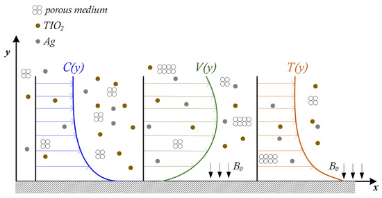 Figure 1 presents the physical model of the problem, the HNF flow of TS-MC, in the two-dimensional (x-y) space. The temperature, velocity, and concentration profiles are drawn across the y-axis and the magnetic field B0 is applied along the y-axis. It is also believed that the hybrid nanofluid is electrically conductive and has a low magnetic Reynolds number, hence the induced magnetic field is neglected. The fluid concentration and ambient temperature are andand the constant mass transfer velocity together with heat and mass transfer in a stationary fluid.