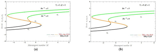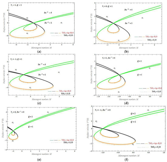 Figure 2a–f present the physical flow of the problem, which depends on the choice of M (Equation (21)), with both positive and negative solutions The physical solution varies in accordance with variations in the Marangoni number M. Solid lines (green, orange, and black) refer to the (TiO2-Ag, H2O) solution, while dotted lines (green, orange, and black) refer to the (TiO2, H2O) solution. In Figure 2a–c, one observes that the physical solutions are obtained for and roots and non-physical solutions are obtained for roots. Furthermore, the physical solutions are directly affected by values. When porosity increases from 0 to 5, one observes that at (Figure 2a—suction case) the physical flow solutions show that the (TiO2-Ag, H20) HNF presents higher velocity values compared to the (TiO2, H2O). At (Figure 2b—impermeable case), the physical flow solutions of (TiO2-Ag, H2O) and (TiO2, H2O) HNF are identical. In Figure 2c, at (injection case), the physical flow solutions of the (TiO2, H2O) HNF present higher velocity values compared to the (TiO2-Ag, H2O).
