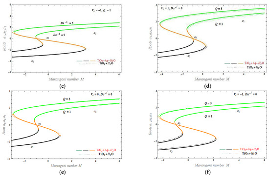 The behavior of the roots versus Marangoni number, M, and various values for the inverse Darcy number, Da−1, mass transpiration parameter, Vc, and magnetic field, Q. (a) Vc = 1, Q = 1, and Da−1 = 1 and 5; (b) Vc = 0, Q = 1, and Da−1 = 0 and 5; (c) Vc = −1, Q = 1, and Da−1 = 0 and 5; (d) Vc = 1, Q = 1 and 5, and Da−1 = 0; (e) Vc = 0, Q = 1 and 5, and Da−1 = 0; (f) Vc = −1, Q = 1 and 5, and Da−1 = 0.