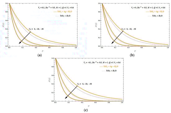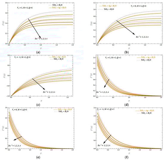 Another parameter of importance is the magnetic field, Q. When porosity and Q increases from 1 to 5, one observes that at (Figure 2d—suction case) we obtain higher velocities for (TiO2-Ag, H2O) compared to (TiO2, H2O); in Figure 2e for (impermeably case), the physical flow solutions of (TiO2-Ag, H2O) are similar to (TiO2, H2O), while in Figure 2f, for (injection case) we obtain smaller velocities for (TiO2-Ag, H2O) compared to (TiO2, H2O).
