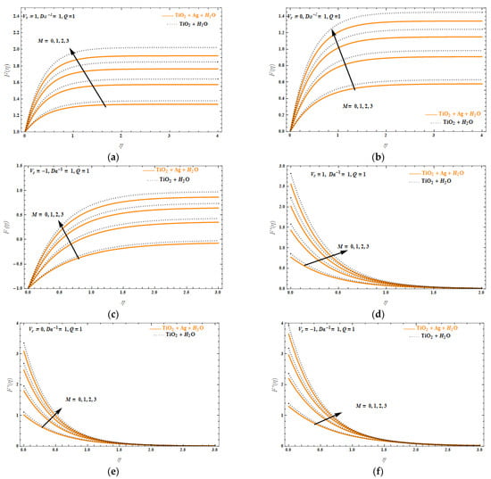 From another perspective, we argue for the effect of on and in Figure 5a–f. For all cases investigated, higher axial and transverse velocities are obtained when M increases, and this increase is always higher when the fluid mixture is (TiO2, H2O) compared to (TiO2-Ag, H2O).