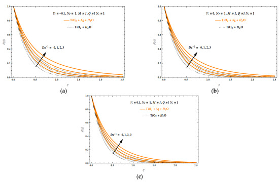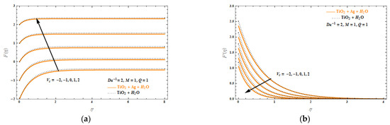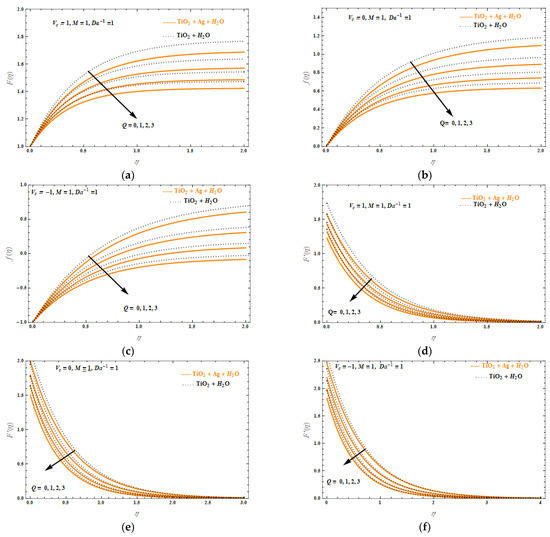 Further investigation is shed on the estimation of the transverse and axial velocity boundaries for the three scenarios of wall mass transfer parameter (suction, impermeable and injection) along with the effect of , Q, and M, in Figure 4a–f. A common trend in all plots is that the velocity and boundary layer thickness of the fluid is decreased when increases from 1 to 4, as well as when the value of decreases. This is because by increasing the value of , this means that there is also a rise in the holes of the porous structure, and this, in turn, decreases fluid flow. Another common characteristic of Figure 4a–f is that higher velocity values are given for the (TiO2, H2O) compared to the (TiO2-Ag, H2O) HNF. We attribute this behavior to the higher density of the (TiO2-Ag, H2O) HNF, which imposes obstacles in fluid motion, compared to the lower density mixture of (TiO2, H2O).