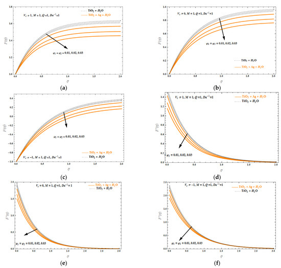 The axial, , and transverse, velocities versus the similarity variable, , for various values of φ1 and φ2 and . (a) F(n), for Vc = 1, (b) F(n), for Vc = 0, (c) F(n), for Vc = −1, (d) , for Vc = 1, (e) , for Vc = 0, and (f) , for Vc = −1. The orange solid line refers to the (TiO2-Ag, H2O) HNF and dotted line to (TiO2, H2O).