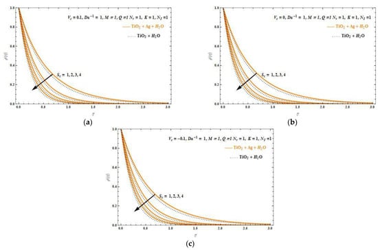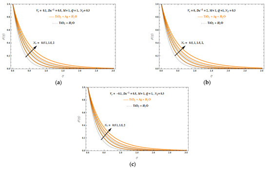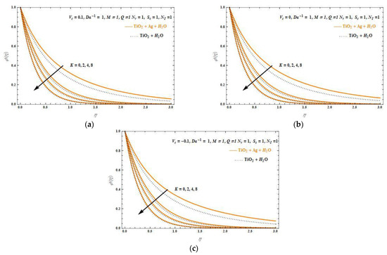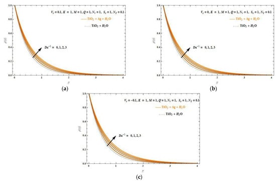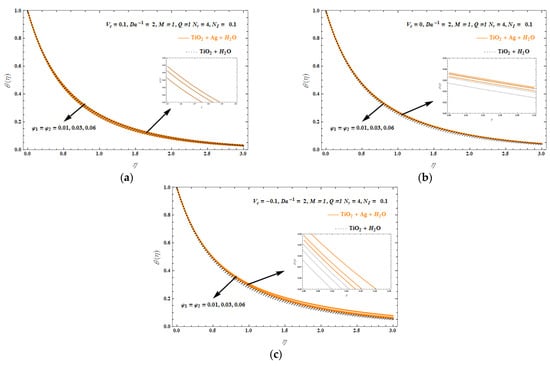 The effects of thermal radiation , heat source and sink , inverse Darcy number and solid volume fraction of TiO2 and Ag in water solution are investigated next. Starting from the effect, as it increases in the range {0.5, 1.0, 1.5, 2.0}, in Figure 9a–c, one obtains greater thickness in the thermal boundary. As long as the effect is concerned, as it decreases in the range , in Figure 10a–c, there is decreasing thickness in the thermal boundary layer. The thermal boundary layer increases when increases (Figure 11a–c). Finally, in Figure 12a–c, one observes that the thermal boundary layer increases while increasing the volume fraction of TiO2 and Ag.