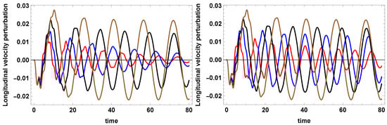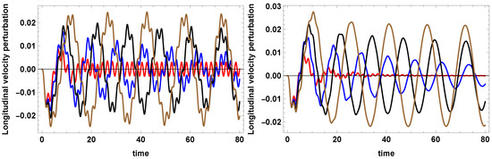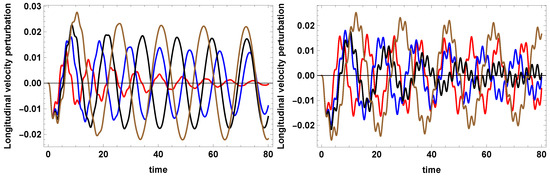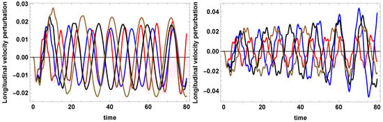 Dimensionless longitudinal velocity perturbations versus dimensionless time computed (left) at for T = 12,000 K, (red curve), K, (blue curve), K, (black curve) and K, (brown curve), with and , and (right) at for T = 12,000 K, (red curve), K, (blue curve), K, (black curve) and K, (brown cirve), with and . The CHIANTI7 radiative function [43,44,45] is used.