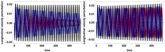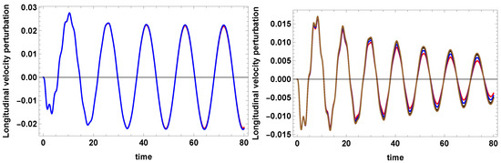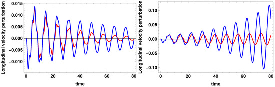 Dimensionless longitudinal velocity perturbations versus dimensionless time computed (left) at for T = 12,000 K, , (red curve) and (blue curve), and (right) at for T = 12,000 K, , (red curve) and (blue curve); . m, and the Hildner [42] radiative function are used.