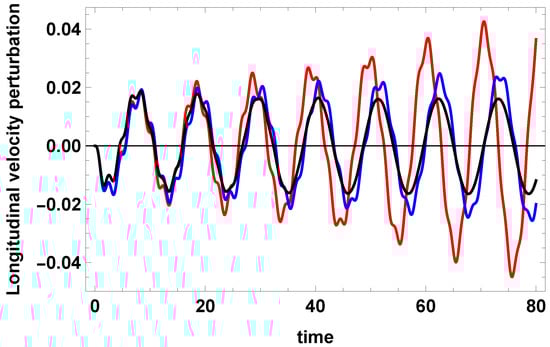 Dimensionless longitudinal velocity perturbations versus dimensionless time computed at for m (red curve), , m (blue curve), , m (black curve), . K; , . The Hildner [42] radiative function is used.