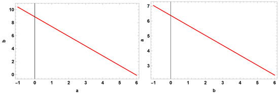 On the other hand, Figure 8 (left), for , shows the behavior of the threshold values of the b exponent, when exponent a varies between and 6, while Figure 8 (right), displays the behavior of the a exponent when the b exponent varies between and 6. In both cases, the behavior is linear, as can be expected from Equations (32) and (33), but if the same value for a fixed in Figure 8 (left) is used for b in Figure 8 (right), the corresponding values for b and a are different, which explains the results obtained in Section 3.4. Summarizing, in Figure 8 (left panel), fixing a value of a, for those values of b below the straight line, one finds damping of the oscillations, while for those above the line, one finds amplification of the oscillations. The same behavior for a can be found in Figure 8 (right) when b is fixed.