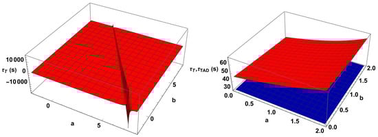 In order to highlight the case when , let us consider T = 12,000 K. Figure 9 (left) shows the behavior of − versus an interval of numerical values for exponents a and b. One can observe how this difference evolves from positive to negative values, going through zero, when a and b are varied within the considered interval: Figure 9 (right) shows the evolution of the imaginary part of the frequency , computed by Equation (28), within the interval of numerical values considered for a and b. From Figure 9 (right) one can see that the imaginary frequency also goes from positive to negative values, becoming zero for certain pairs of a and b values. Next, Figure 10 (left) shows the variation of the thermal time, , and demonstrates a discontinuity, which well highlights that, for certain pairs of values of a and b, the thermal time becomes infinite, corresponding to . Figure 10 (right) shows, for a reduced interval of values of a and b, a comparison between the thermal time and the ambipolar diffusion time, which is constant once the temperature is fixed.