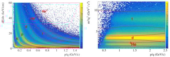 Identification of charged hadrons and light nuclei in the analysis relies on the combination of the information on the ionization energy loss, (the energy deposited by charged particles in layers of thickness ) in the TPC gas and the mass-squared from the TOF. The information under interest ( or ) is compared to the expectation for a given species. For the case of the ionization loss, the expected value is taken from the Bethe–Bloch distribution, while for the case of mass-squared, the ‘measured’ value is compared to the particle’s rest mass. In Figure 2, the specific energy loss and mass-squared for hadrons and light nuclei from Bi+Bi collisions are shown as a function of rigidity, . The red lines indicate the boundaries from the expected positions used to separate particles of different types; here, denotes the corresponding resolution. It should be noted that momentum reconstruction relies on the assumption that all particles are singly charged. Thus, for double-charged nuclei (He and He), the reconstructed momentum is two times less than the actual one, and the calculated mass-squared is less then the nominal value by a factor of 4. In this case, He and deuteron candidates have the same , and discrimination between these two species is achieved using only the ionization loss information. Once a helium candidate is selected within the expected boundaries, the correct momentum information can be obtained from the refit procedure using the proper value for the electric charge of the candidate.