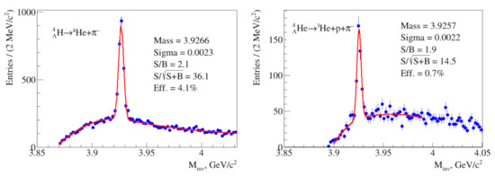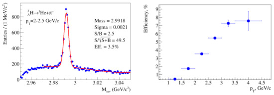 Hypertritons are reconstructed through the topological decay, He+. Once a pair of tracks identified as He and a negatively charged pion are selected, the distance of closest approach (DCA) between the candidates is defined, thus determining the decay point of the hypertriton candidate. However, if the DCA value is larger than a given threshold, the pair is rejected. For the successive candidates, each daughter track is propagated back to the main vertex, requiring it to have a minimum DCA to the primary vertex to avoid selecting primary particles as daughters. Using the values of the reconstructed momentum components of the tracks, the momentum and the invariant mass of the hypertriton candidate are calculated. Further selection regards the direction of the reconstructed momentum vector of the candidate, which is required to point to the main vertex position by applying a cut in the cosine of the pointing angle. The analysis of reconstructed invariant mass distributions is performed in bins of transverse momentum, of GeV/c width, where () are the particle momentum components in x (y) direction. An example distribution for = 2.0–2.5 GeV/c is shown in Figure 3 (left). Blue symbols indicate the reconstructed data. The shown invariant mass distribution can be described (fitted) by a sum of a Gaussian and a polynomial. The Gaussian corresponds to the signal peak, while the polynomial represents the background (uncorrelated combinations of candidates which passed selection criteria) in a certain range around the mass peak. The resulting fit is plotted in Figure 3 (left) by the red line. One can also indicate the signal parameters (mass and sigma) as well as the signal-to-background ratio () and significance (). The raw signal is extracted by summing the bin content of the histogram over the region around the nominal peak position. The amount of the combinatorial background, which is estimated from the fit, is subtracted from the bin-counted signal. The extracted signal value in each -bin is then corrected by applying the efficiency coefficient. This overall efficiency was obtained from the Monte Carlo data and includes the detector acceptance, the branching ratio, the reconstruction efficiency of the daughter particles, the particle identification efficiency of daughters, as well as the efficiencies of topological cuts applied in the secondary vertex reconstruction procedure. Figure 3 (right) shows the overall reconstruction efficiency for hypertritons as a function of .