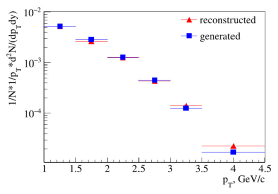 A fully corrected invariant transverse momentum spectrum of hypertritons from Bi+Bi collisions is plotted in Figure 4. The reconstructed points, which are shown by red symbols, are compared to the initial distribution from the model (blue symbols). As can be seen, both spectra agree within the errors.