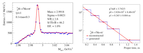 Left: invariant mass spectrum of (He,) pairs in the proper time interval 0.1–0.3 ns. Right: proper time distribution of hypertritons with the fit (2) to extract the lifetime parameter (solid line). The reconstructed data are shown by solid symbols, and the blue histogram shows the model predictions. The ’pl’ denotes the lifetime parameter.