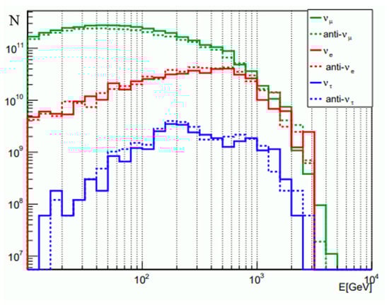 Energy spectrum of the different types of incoming neutrinos and anti-neutrinos as predicted by the DPMJET/FLUKA [7,8] simulation. The result of the simulation has been normalized to produce neutrino spectra for 290 fb−1 [3].