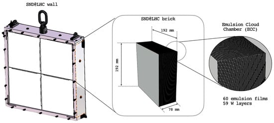 The SND@LHC neutrino target and vertex detector is made of five walls with a sensitive transverse size of 384 × 384 mm2, and it amounts to 830 kg. Each wall consists of four cells (bricks), made of 60 emulsion films, interleaved with 1 mm tungsten plates. Tungsten was selected as the target material in order to maximize the interaction rate per unit volume. Its small radiation length allows for good performance in the electromagnetic shower reconstruction. The resulting brick has a mass of 41.5 kg and a total thickness of ∼78 mm, making ∼17 X0, where X0 is the radiation length. A schematic of one wall is shown in Figure 3. The entire SND@LHC neutrino target contains 1200 emulsion films, for a total of about 44 m2.
