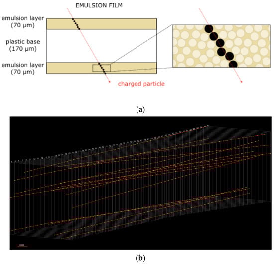 A nuclear-emulsion plate consists of two sensitive emulsion layers, each poured onto a plastic substrate. The reconstruction of the so-called micro-tracks, which are the tracks traversing each sensitive layer of an emulsion plate, is performed in the process of online scanning. The xy coordinate plane is related to the surface of the emulsion plate. Since an emulsion film is formed by two emulsion layers, the connection of the two micro-tracks through the plastic base provides a reconstruction of the particle’s trajectory in the emulsion film, called a base-track. The reconstruction of particle tracks in the full volume requires connecting the base-tracks in consecutive films (Figure 4a). The track reconstruction in the emulsion target is performed using a Kalman filter seeded on the base-tracks recorded in the single emulsion films. An example of the track reconstruction is presented in Figure 4b. Comparing the position and angle of each base-track with a linear fit on the xz and yz planes leads to an estimation of the tracking resolution. The z axis is directed along the beam.