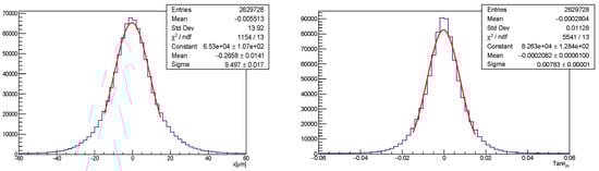 The first results are presented in Figure 7, with the Gaussian fits leading to the widths σX ∼9 µm for the position and σTX ∼8 mrad for the slope as the tangent of the track angle in the zx plane. The presented Gaussian fits indicate a high accuracy of track reconstruction in the emulsion target.