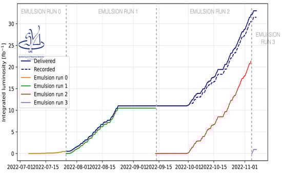 The first phase of the SND@LHC experiment was put into operation since the start of LHC Run 3 and was implemented during 2022. Emulsion Runs 1–3 were carried out using full emulsion targets with different luminosity exposures. The last one ended by the time of the LHC Run 2 technical shutdown on 28 November 2022 (see Figure 8).