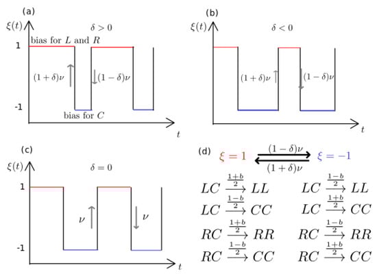 Illustration of the 3CVM under binary social switching at rate (where is the average switching rate and the switching asymmetry). (a) versus time t when : most time is spent in social state favouring polarization. (b) versus t when : most time is spent in social state favouring centrism. (c) versus t when : switching is symmetric and the same average time is spent in . (d) When there is a bias favouring the spread of L (leftists) and R (rightists): and are the reactions with the highest rate, (where b denotes the social influences bias). The social environment favours the spread of centrism: the reactions and have the highest rate, , under . See text for details. In (a)–(c), initially .