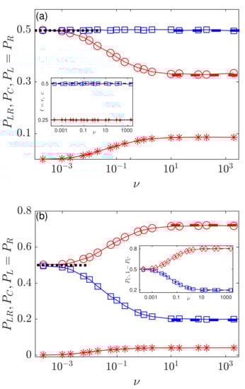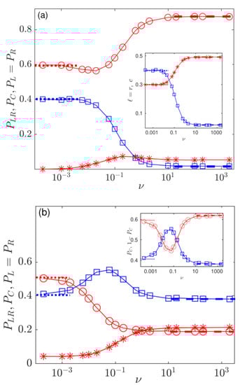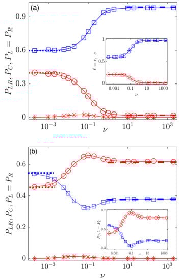 We can determine when these probabilities increase with by solving Equation (9). When , we find and . When and hence increase with when and , respectively; see Figure 5. In the case , is a decreasing function of and C is generally the minority opinion (); see the inset in Figure 5b. As shown in Figure 5a, when then , and we find that the probability of centrist consensus remains essentially constant: . When and , the final densities of voters are and ; see the inset in Figure 5a.