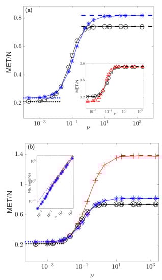 In this regime, the MET follows readily from the solution of (A10), and its scaling is obtained from Equation (A11). Using the symmetry of , we have , which boils down to when . Furthermore, when , we obtain , which is independent of the influences bias b. In Figure 6, the predictions of Equation (11) are in close to perfect agreement with the simulation results for in all scenarios (, and ).