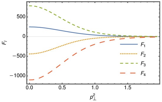 Some form factors, such as the function of transverse gluon momenta, , for longitudinal momenta, . Dimensionless notations and are used, form factors are dimensionless. See [] for the detailed form of and .
