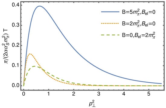 where is the strength of the magnetic field, B is the strength of the chromomagnetic field, and are the electromagnetic and strong coupling constants, respectively, is the colors quantity, denotes the color trace, and is the quark charge in units of electron charge. As one can see from the dependence of the squared amplitude, , in Figure 3, the chromomagnetic field (dotted line) enhances the conversion at small transverse momenta, , in comparison with the pure magnetic field (dashed line). As mentioned above, the strength of the chromomagnetic field is much greater than the magnetic one [] since the lifetime and strength of chromofield are related to the scalar gluon condensate, . Therefore, we also expect an increase in the photon production probability for a wide range of momenta (solid line).