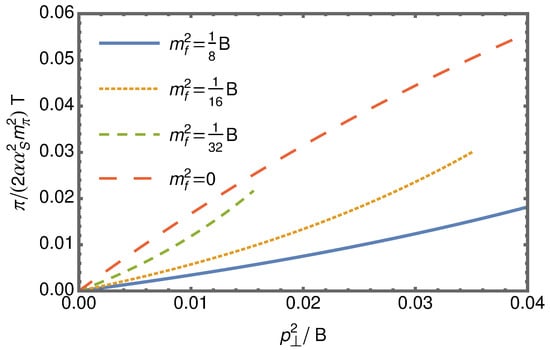 One can check the dependence of the squared amplitude for massive and massless quarks in the specific range of gluon momenta . The full expression for in the case of massive quarks and the details related to the limit of gluon momenta can be found in Ref. []. From Figure 4, One can see that an increase in the quark mass leads to a result that differs from the massless case. Additionally, the expansion of the propagator in Landau levels is not correct for the strange quark.