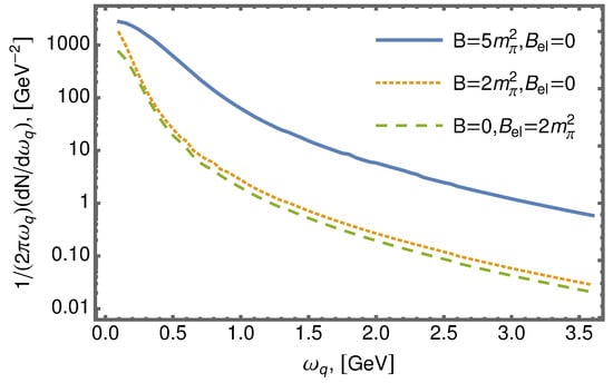 and and are the modified Bessel functions of the first kind. represents the high gluon occupation factor and is the . The factor is obtained by squaring the delta function for energy-momentum conservation in the amplitude. Some arguments and comments about the numerical values of the parameters can be found in Ref. []. The comparison of the differential energy distribution (7) for generated photons in the background magnetic, , and chromomagnetic, B, fields is shown in Figure 5. One can see that the chromomagnetic field (dotted line) enhances the effect in comparison with the pure magnetic field (dashed line) with the same strength. We also expect a significant increase in the photon signal due to the high strength of the chromomagnetic field, which is determined by gluon condensate (solid line).