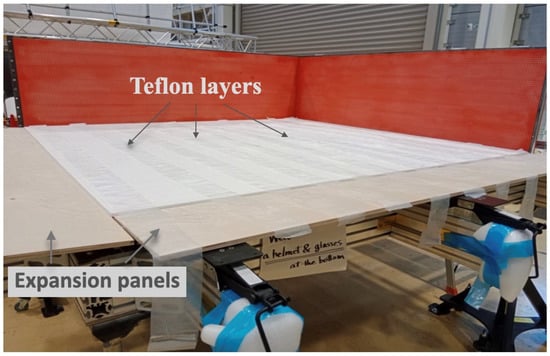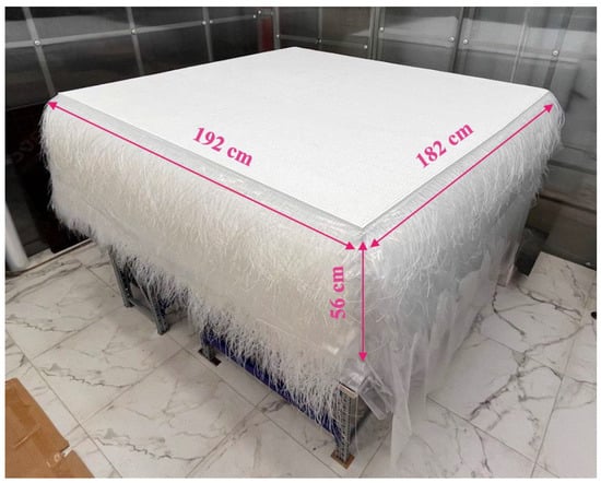 The next stage is the procedure of sequentially stacking 56 SuperFGD layers of cubes each, assembled with horizontal fishing lines, on the bottom panel of the box. For this purpose, 10 teflon strips were prepared and rolled out on the bottom panel, and 2 expansion panels were installed on the open sides of the box to provide additional sliding of the SuperFGD layers when they are stacked on top of each other, as shown in Figure 13.