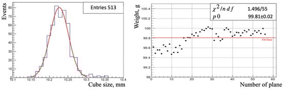 (Left) distribution of the cube side length. A total of 513 cubes were measured in random order: one side per cube. The red curve represents the Gaussian fit. (Right) weight distribution of a single cube. The “ndf” denotes the degrees of freedom for the fit with the straight line with the parameter .